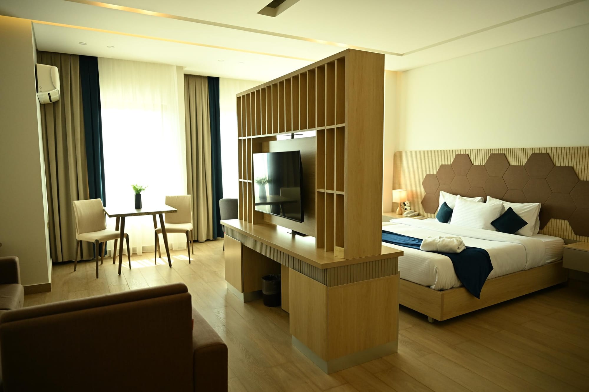 Family Suits has a large double bed (king size) , kitchen and one bathroom It's Price is Trendy Prices include all Taxes , Breakfast for 2 , Gym ,Pool , kids area entry